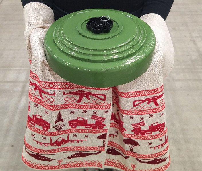 In the realities of the modern world, in the conditions of war, friendship between the Slavic peoples has ended. Therefore, this installation carries a sacred and symbolic meaning. Instead of bread and salt, an anti-tank mine with a check. This is how Ukraine now meets aggressively-minded "guests". And on the handbrake, instead of a traditional ornament, weapons and explosions are embroidered, as symbols of war.